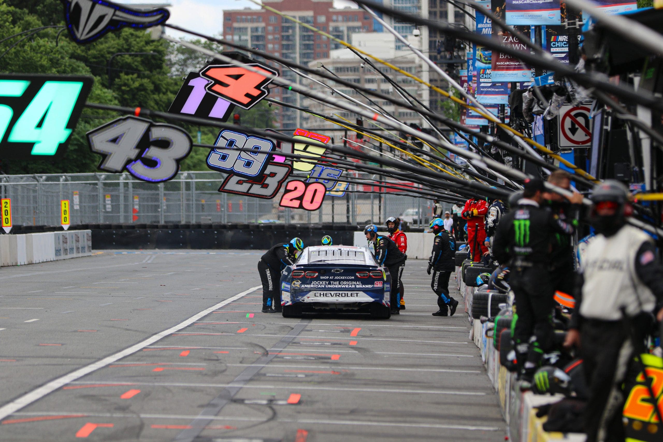 Daniel Suvarez estuvo involucrado en un accidente tardío y fue un hombre solitario en Pitt Road con el final de la carrera. Terminó 69 vueltas y terminó 29. (Foto Ed McGreger/Fox Sports)