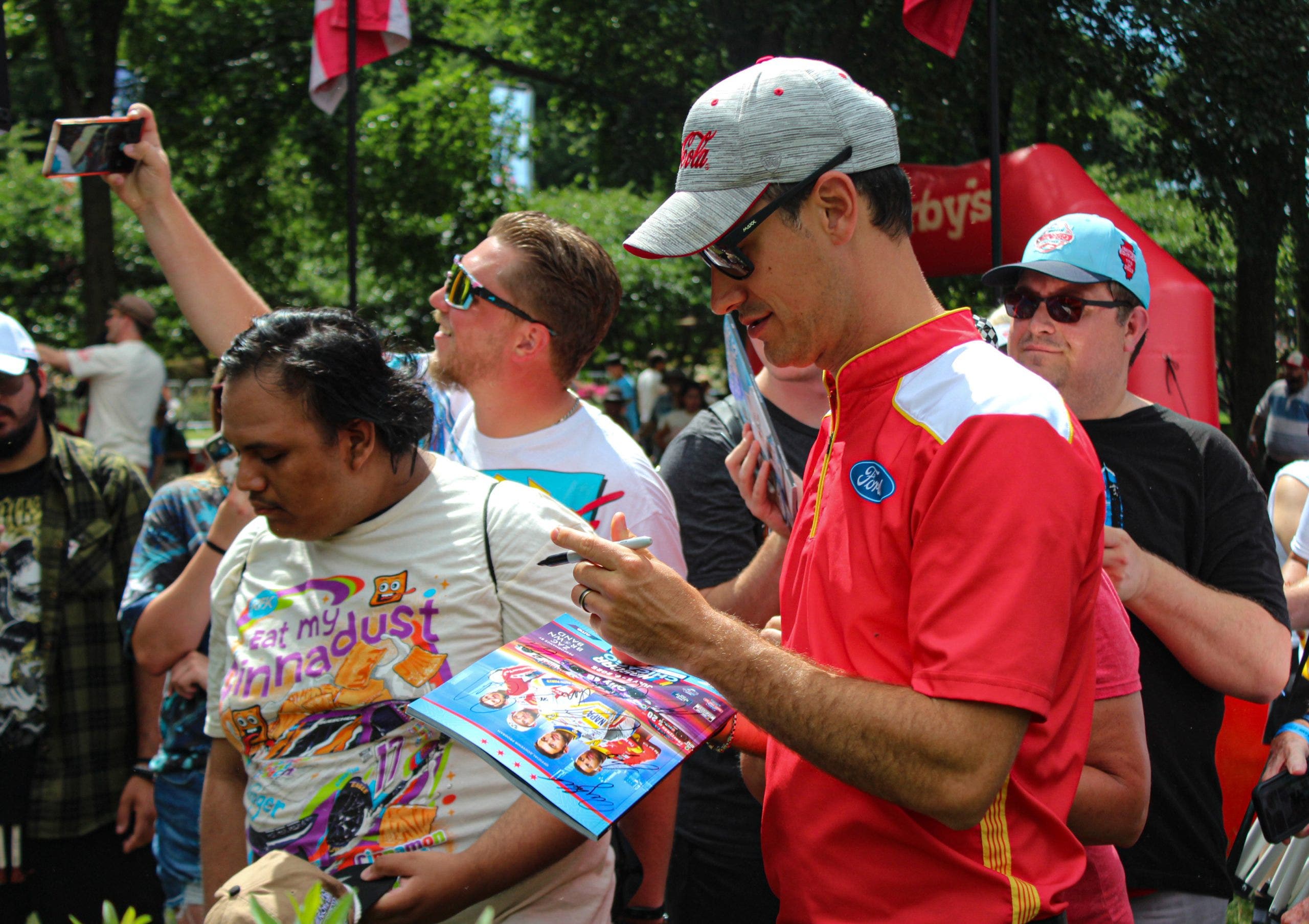Joey Logano habla con fanáticos y firmas en el campo del festival antes de ir a su garaje. (Foto Ed McGreger/Fox Sports)