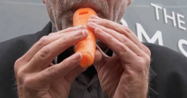 Miembros Orquesta de vegetales de Londres Los agujeros se tallan cuidadosamente en grandes zanahorias, cultivadas localmente para que cree flauta comestible; este proceso tarda 20 minutos en completarse.