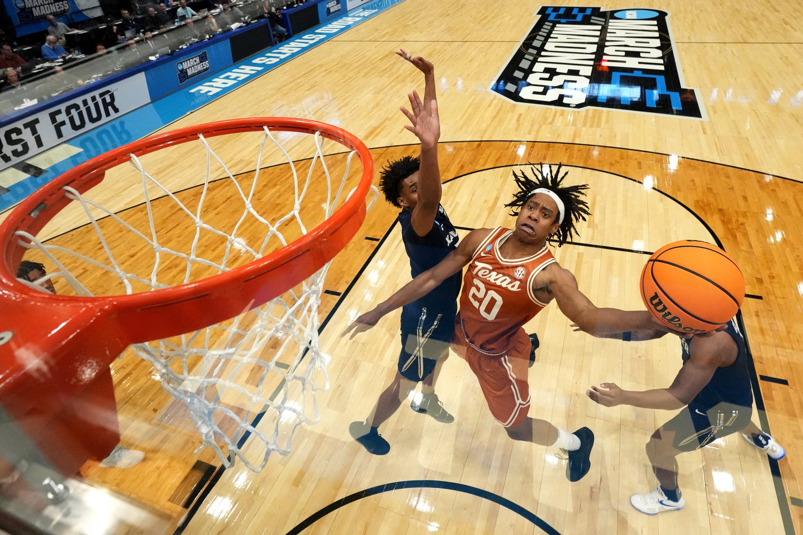 Kaman Maluwatch Khaman Maluwach #9 en la primera mitad del torneo de baloncesto masculino de la NCAA en los últimos cuatro juegos bloquea el balón en la primera mitad. (Fotos de Tyler Shank/NCAA por imágenes