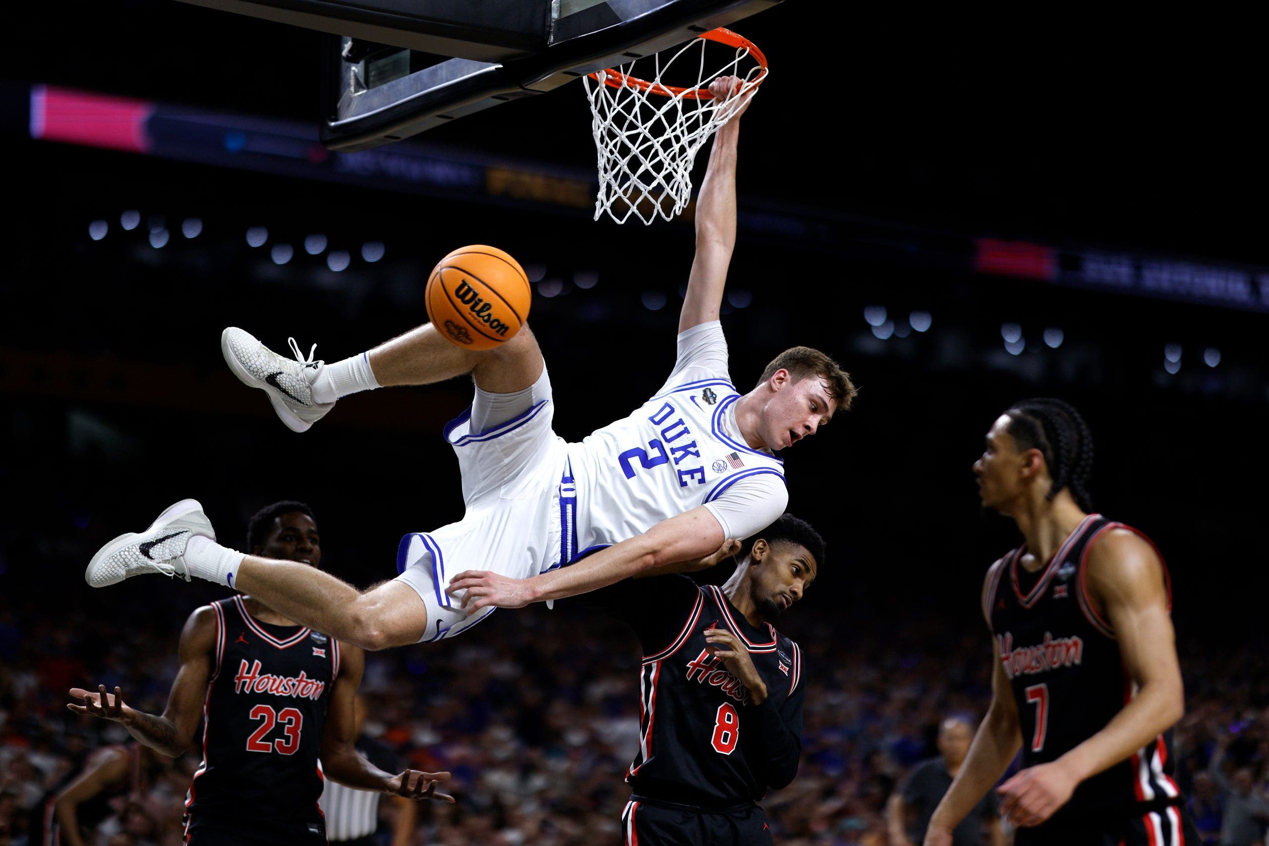 En las últimas cuatro ronda del torneo de baloncesto masculino de la NCAA, la bandera de Duke Blue Devil’s Cooper #2 movió el balón contra Houston en la primera mitad. (Photo Lance King/Getty Images)