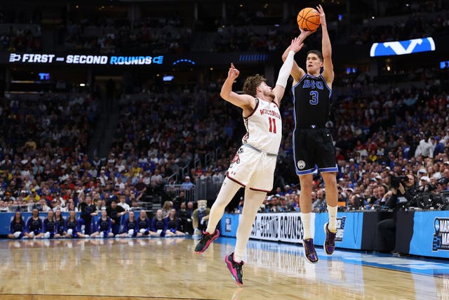 En la segunda ronda del torneo de baloncesto masculino de la NCAA, el curso de Brigham Young Demin #3 3 puntos de Egor Dmin #3 3 puntos contra Wisconsin. (Foto Matthew Stockman/Getty Images)