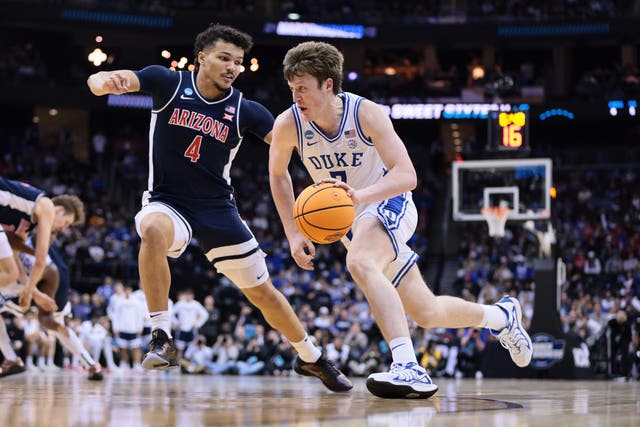 En la segunda mitad de la ronda Sweet 16 del torneo de baloncesto masculino de la NCAA 2025, el cono de Duke Blue Devils reduce el balón contra el Newppell #7 Arizona. (C. Morgan Engel/NCAA Photo de Getty Images)