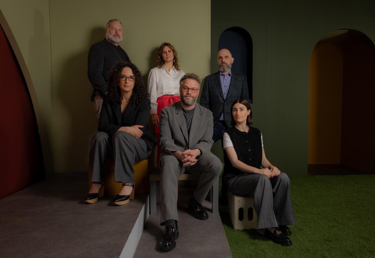 Showrunners R. Scott Gemmill («The Pitt»), Lauren Lefranc («The Penguin»), Craig Mazin («The Last of Us»), Debora Cahn («The Diplomat»), Seth Rogen («The Studio») y Jen Statsky («Hacks») Pose for Post Env.