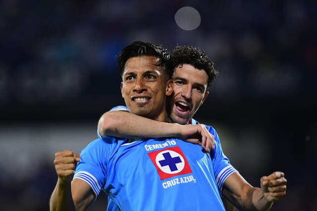 Después de marcar el quinto gol del equipo en la Universidad Estadio Olimbiko, el ángel Selvetha (L) de Cruz Azul (L) Jose Ignacio Revereo (R). (Foto Jaim López/Jam Media/Getty Images)