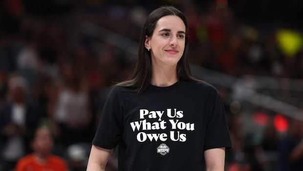 Todos los jugadores en Team Clark y Team Collier se calentaron en camisas para el Juego de Estrellas de la WNBA el sábado por la noche, leyendo «Pagónos lo que tienes que pagar».