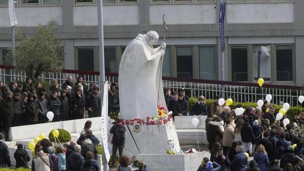 Docenas de niños rezan por el Papa Francisco al lado del hospital