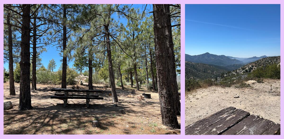 1. Uno de los muchos campamentos sombreados en el campamento de Chilao. 2. Algunos lugares de campamento en el campamento de Chilao ofrecen vistas de las montañas circundantes.