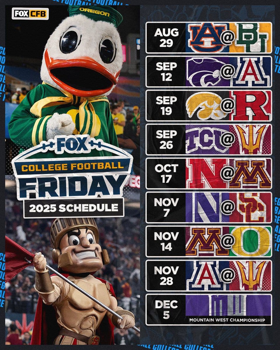 «Fox College Football Friday» comienza el 29 de agosto Anteriormente Levantar Balar En el Wako de Texas, el Campeonato Fox Mountan West termina el 5 de diciembre.