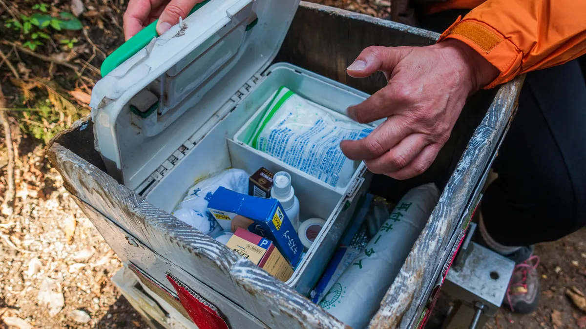 - Medicamento Un kit con elementos esenciales como únicos, tiras, cinta, alcohol o tela.