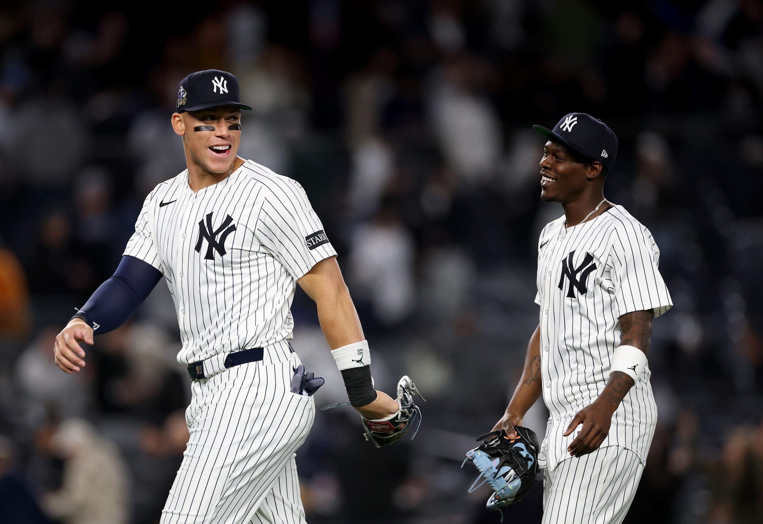 Aaron Judge #99 y Jazz Chisholm Jz. Jazz Chisholm Jr. #13 de abril de 2025 en Kansas City Reales en el Yankee Stadium en Bronx. (Foto de Elsa/Getty Images)