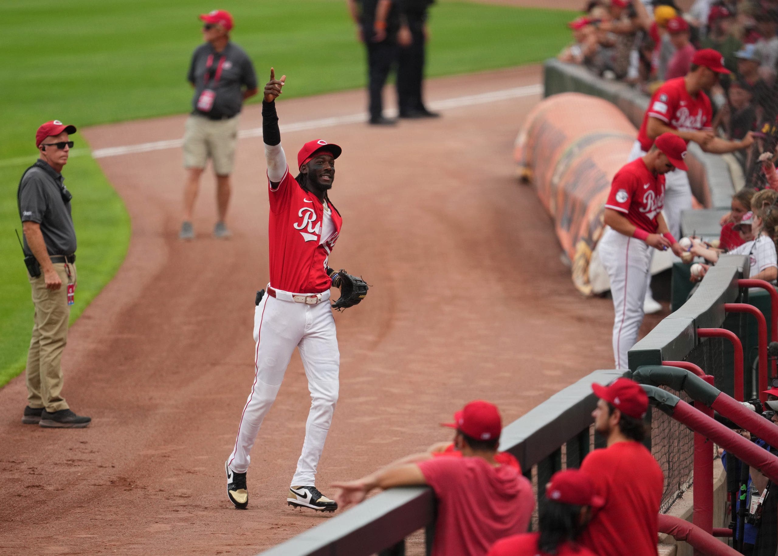 Ellie de la Cruz #44 de Cincinnati Reds aceptó a sus fanáticos el 09 de julio de 2025 en el Great American Ball Park contra Miami Marlins. (Foto Jeff Dean/Getty Images)
