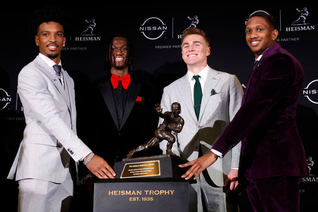 Jaden Daniels (izquierda), Michael Penix Junior (derecha a derecha) y Bo Nix (derecha a segunda) al 2023 Hesman Trophy Finalists tendrá que enfrentar a los dos cubos restantes esta temporada. (Foto Sarah Sterer/Getty Images)
