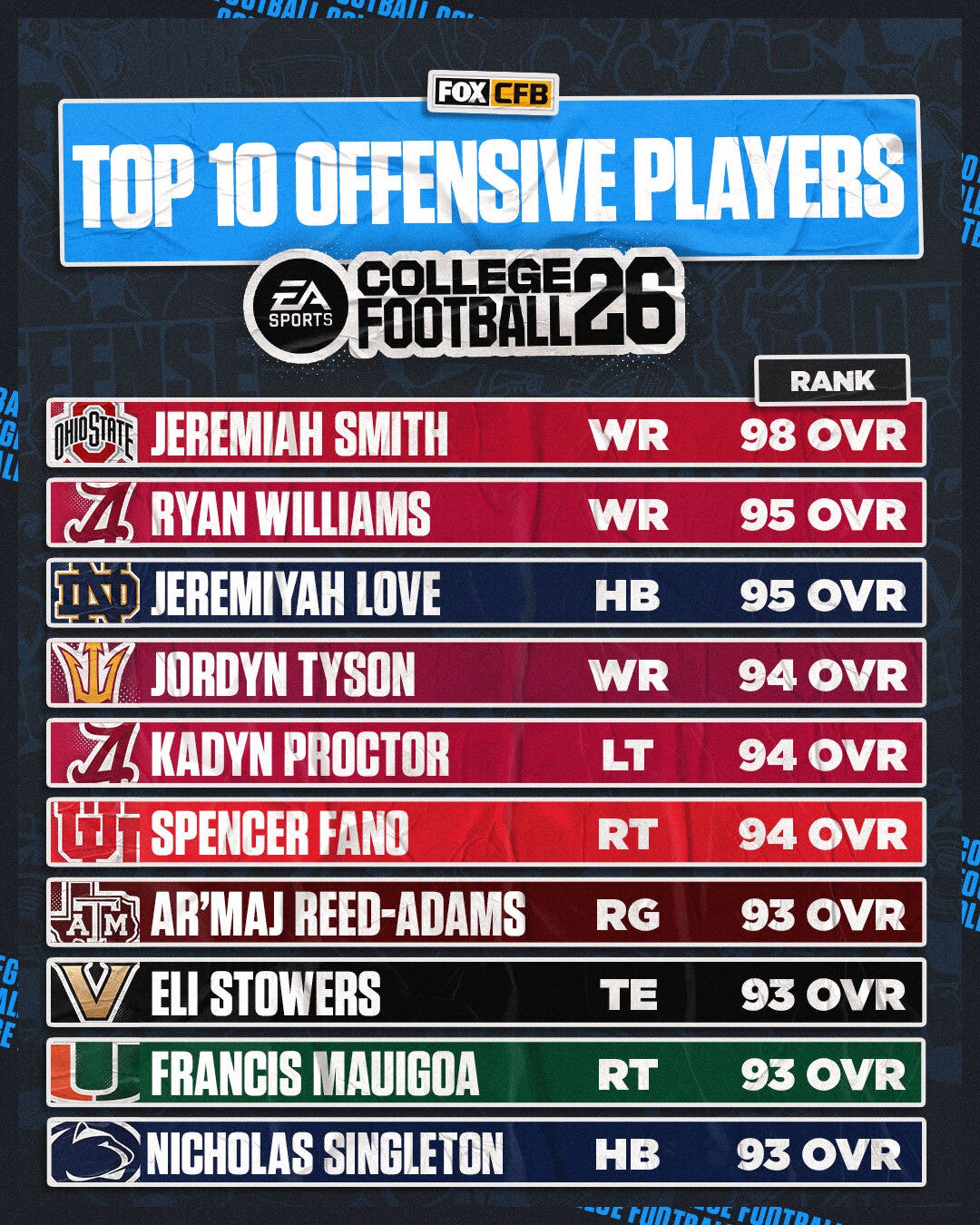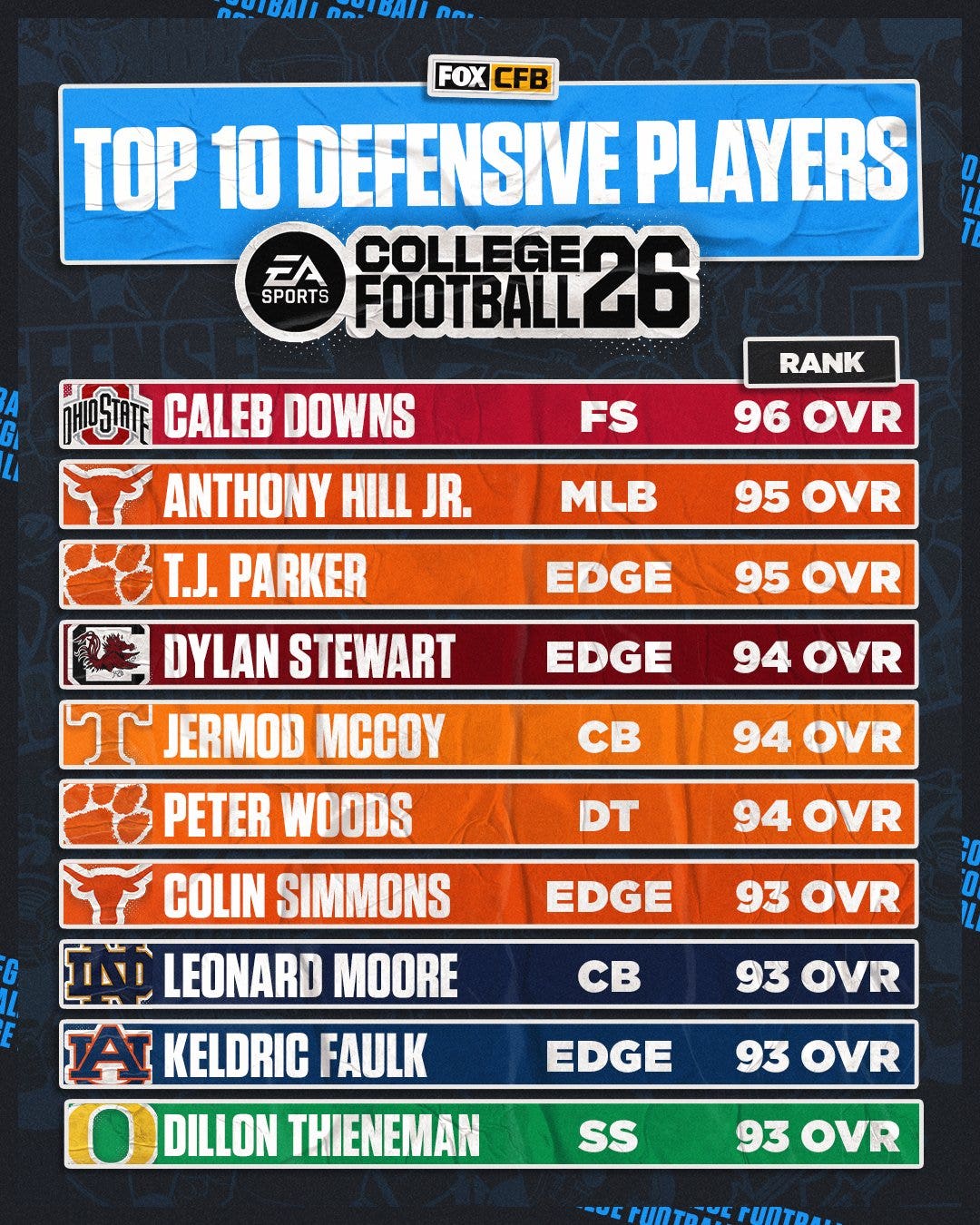 ‘College Football 26’: 10 cubil de jugadores de mayor calificación, ofensivos y defensivos