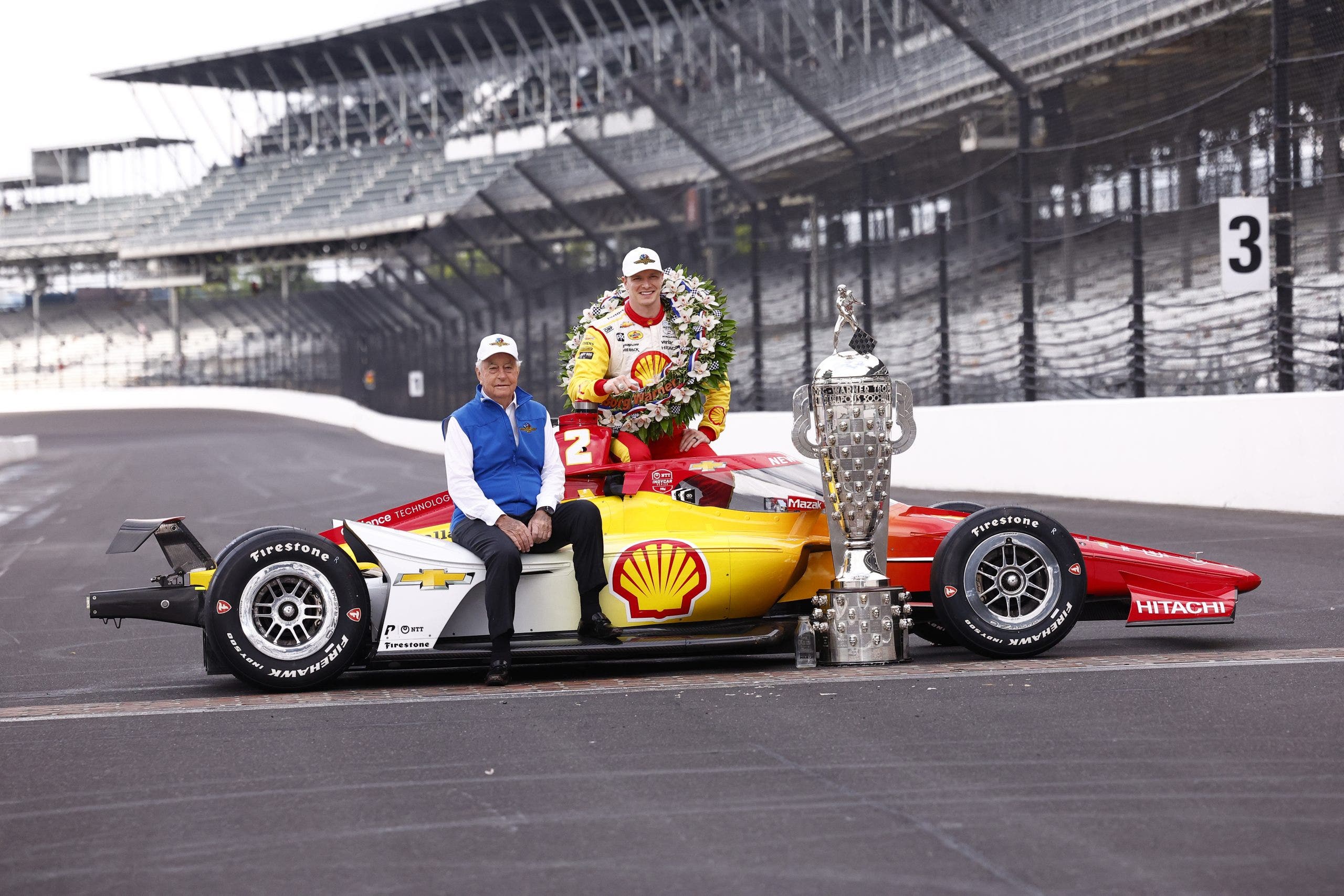 Joseph Newgarden (equipo Penske) y el propietario del equipo Roger Penske después de 2024 Indi 500