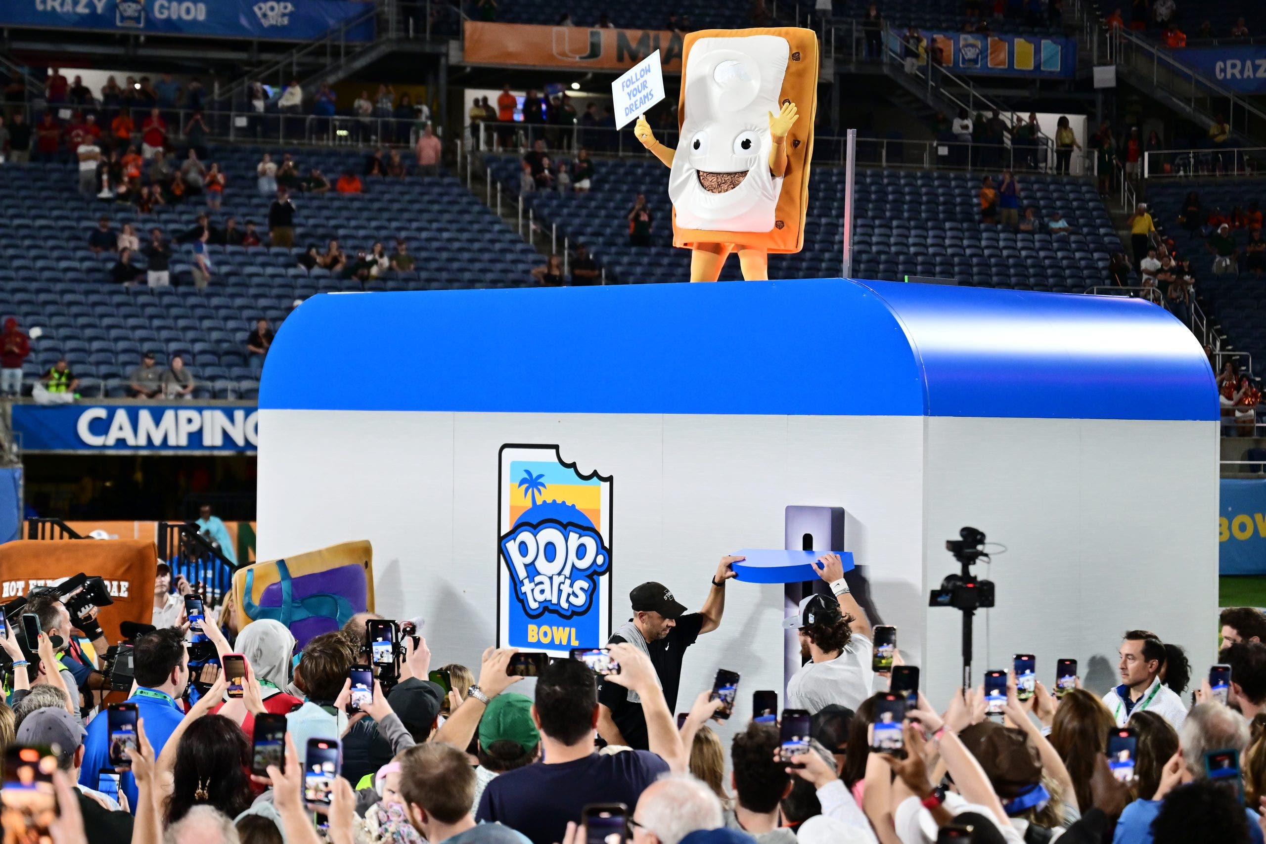 Este año pasado, mariscal de campo estatal de Iowa Rocco becht Después de ganar sobre el Miami (Fl.), La mascota de Cinnamon Roll Pop-Tarts fue enviada a Cafita. Estado de Kansas Cinnamon Roll Pop-Tarts Muscat también se colocó en la tostadora un año antes.