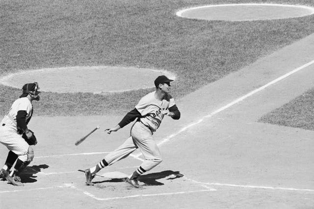 Ted Williams va a la primera base después de golpear la pelota de tierra en las primeras entradas del juego de calcetines anclados. (Por el Getty)