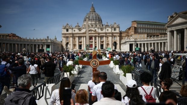 Un viajero lleva una cruz cerca de St. Peters Square el lunes. (Gugglemo Mangiapane/Reuters)