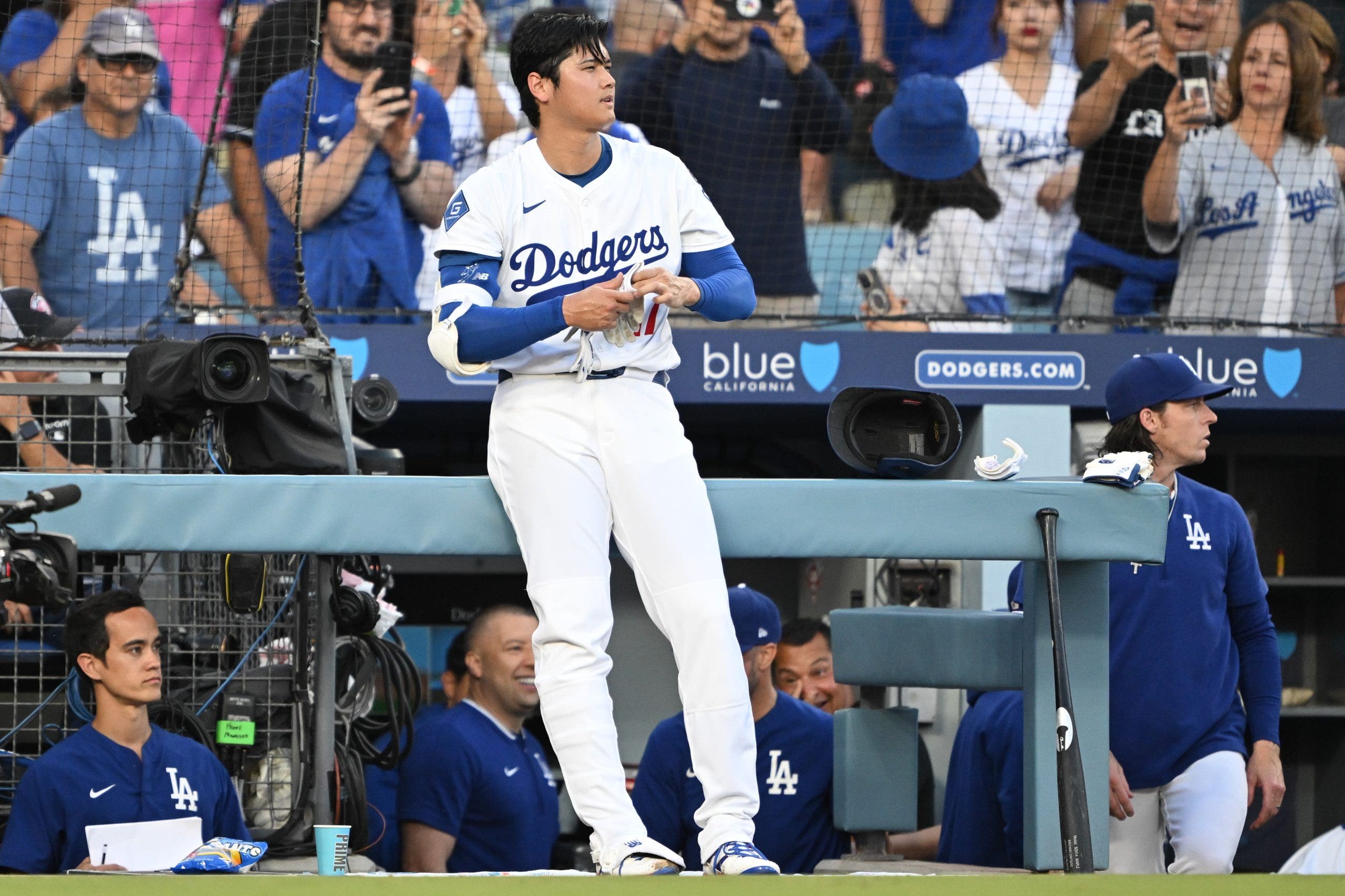 Al final del marco de 28 lanzamientos, Ohtani pasó por un cheque adhesivo ritual de las letras del beneficio de seguridad en la línea de tercera base y el banquillo de los Dodgers, el puño, Will Smith y el árbitro. Nunca volvió al banquillo.