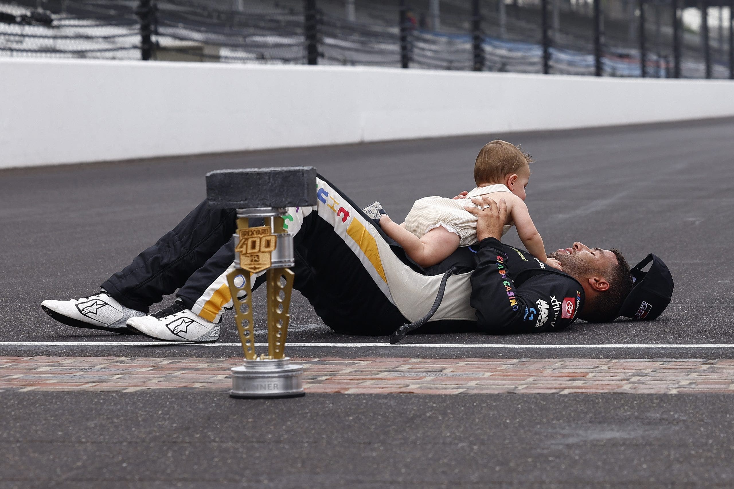 Bubba Wallace agotado celebra después de ganar el ladrillo 400 con su hijo Bex