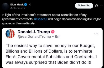 El anuncio se produjo después del puesto de Trump, en el que la forma más fácil de ahorrar miles de millones de dólares de nuestro presupuesto es eliminar el subsidio del gobierno y la eliminación de los contratos de Elon. Siempre estoy pensando por qué Biden no lo hizo. Trump atacó a Musk que Musk estaba muy decepcionado, especialmente cuando se opuso firmemente a un gran proyecto de ley en el gobierno de Musk, y lo describió como una destrucción y déficit de políticas.