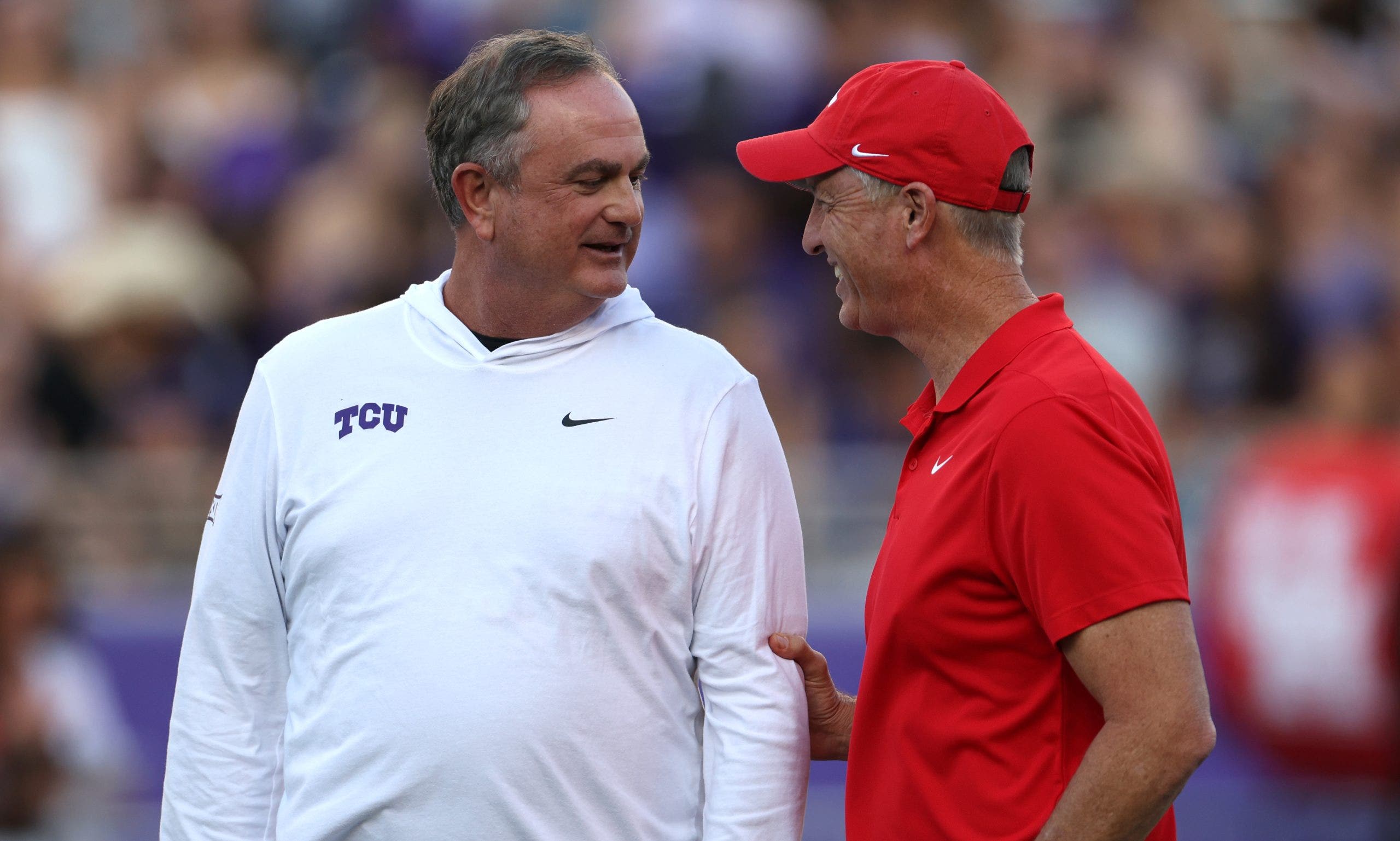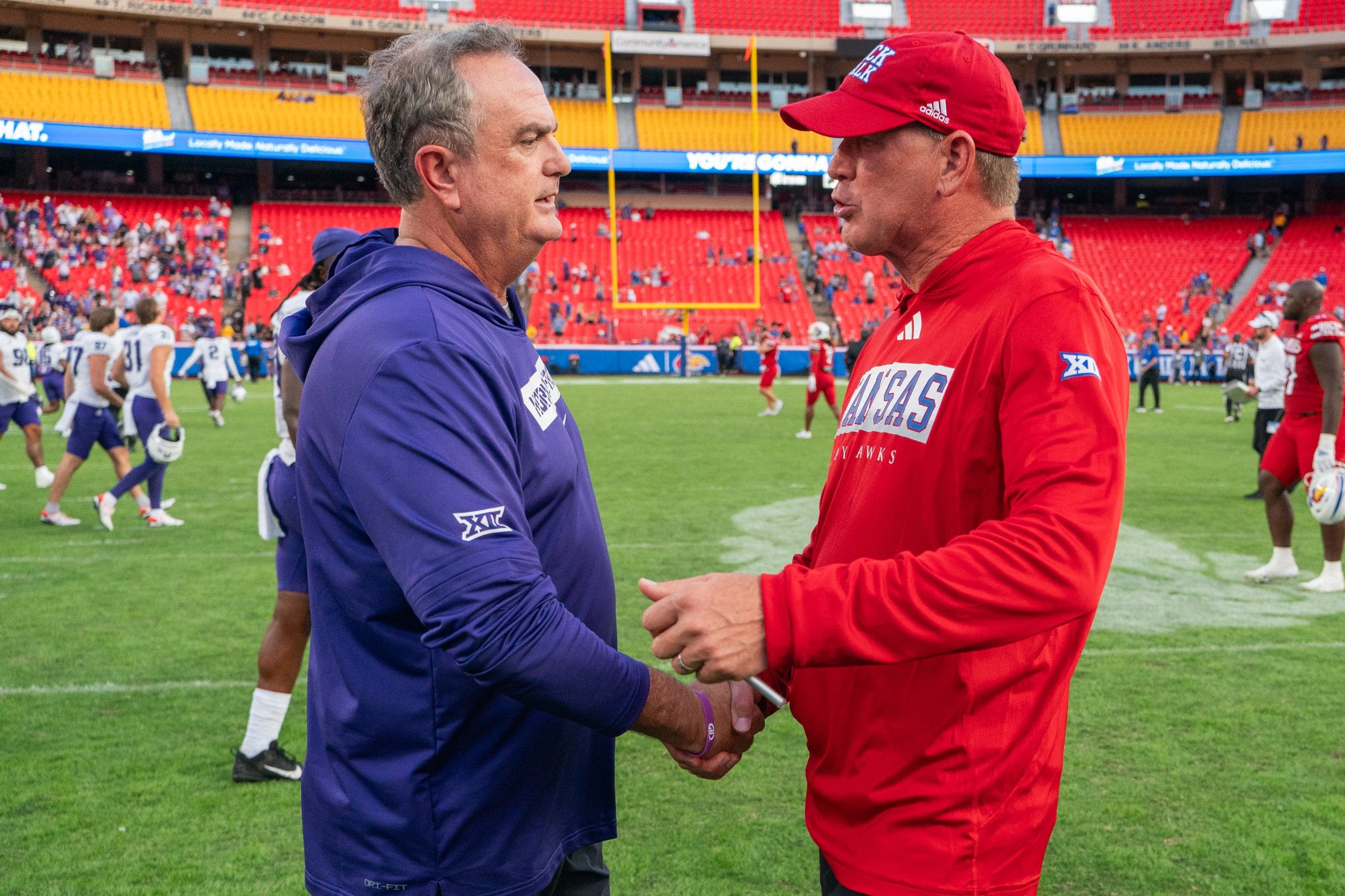 El entrenador en jefe de TCU, Sony Dixes, el entrenador en jefe de Kansas, Lance Leapold se encuentra después de derrotar a TCU Kansas en el Estadio de Arrow Head. (Foto Kyle Rivas/Getty Images)