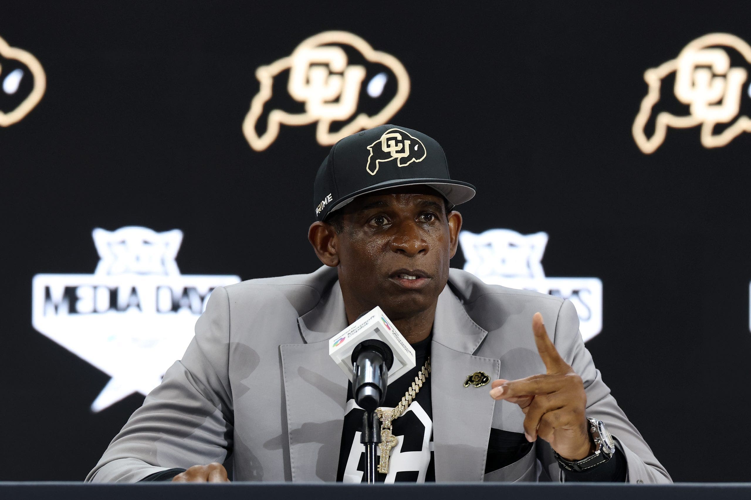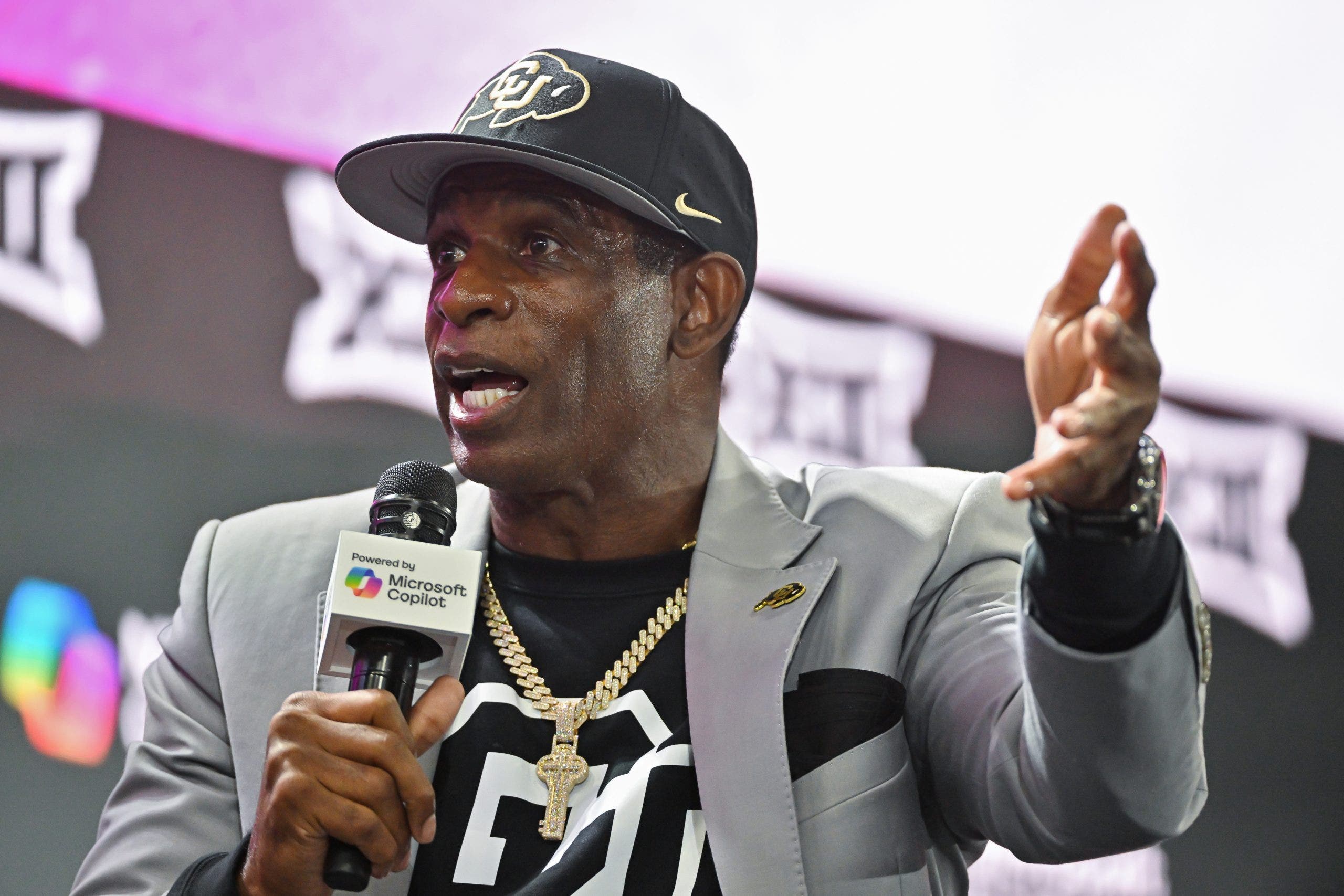 El entrenador de Colorado, Dion Sanders, Big habla con motivo de la mesa redonda de los entrenadores en 12 días. (Foto de Austin Macafi/Icon Sports Spire por Getty Images)
