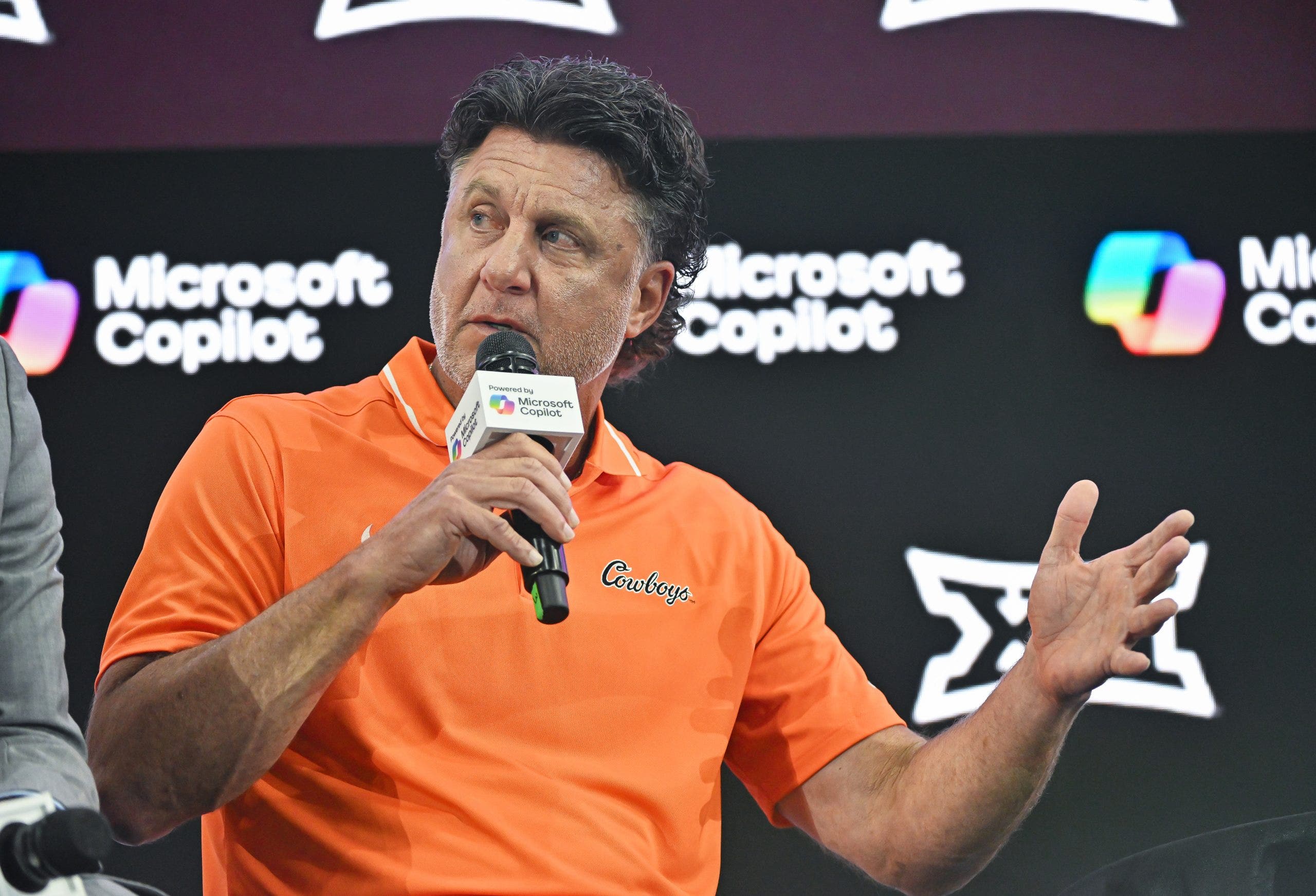 El entrenador del estado de Oklahoma, Mike Gundi, habló durante la mesa redonda durante el segundo día de los 12 días de los medios de comunicación. (Foto de Austin Macafi/Icon Sports Spire por Getty Images)
