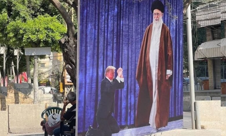 Trump en la rodilla frente a Khameni … los carteles en el Líbano y los partidarios iraníes están celebrando ‘Jeet’ – Partido de la Guerra de Irán Israeli Donald Trump Póster Líbano Beerut Ali Khameni NTC