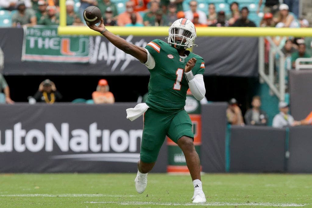 En Miami, el Ward 2024 estableció récords de programas de temporada para una sola temporada para yardas aéreas (4,313) y touchdowns (4,313) y touchdowns (39), otorgaron anualmente el mejor mariscal de campo en el fútbol universitario. (Foto Leonardo Fernández/Getty Images)
