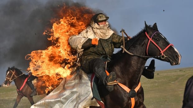 Los acrobacias de fuego del jinete de caballos en la región de Narrin de Kirguistán en galups orientan y equipos la raza ecuestre. (Vladimir Voronin/Associated Press)