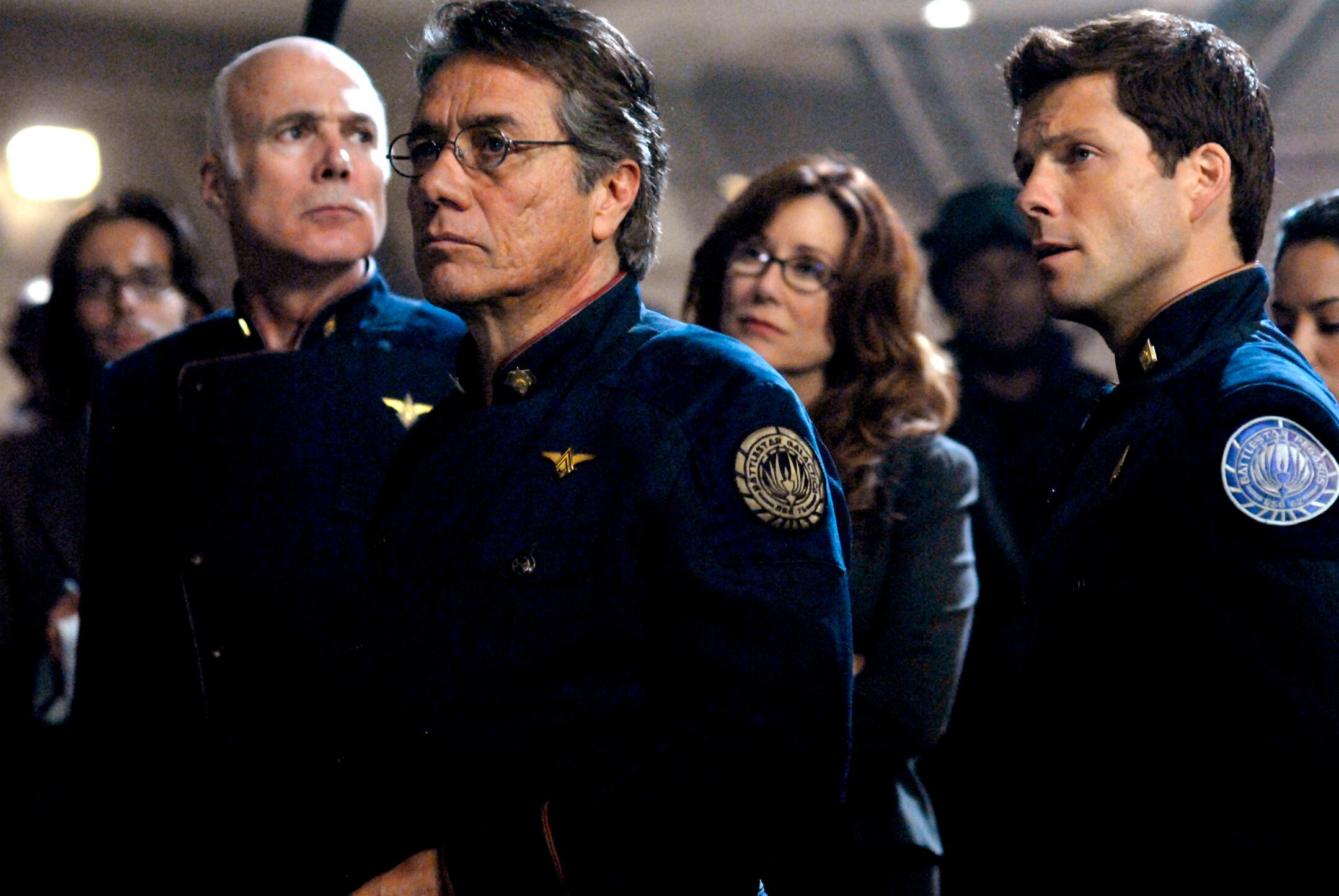 Michael Hogan como coronel Saul Tigh, izquierda, Edward James Olmos como almirante William Adama, Mary McDonnell como Laura Roslin y Jamie Bamber como Lee «Apollo» Adama en la película de televisión «Battlestar Galactica: Razor», parte del canal Sci-Fi Channel que es popular.