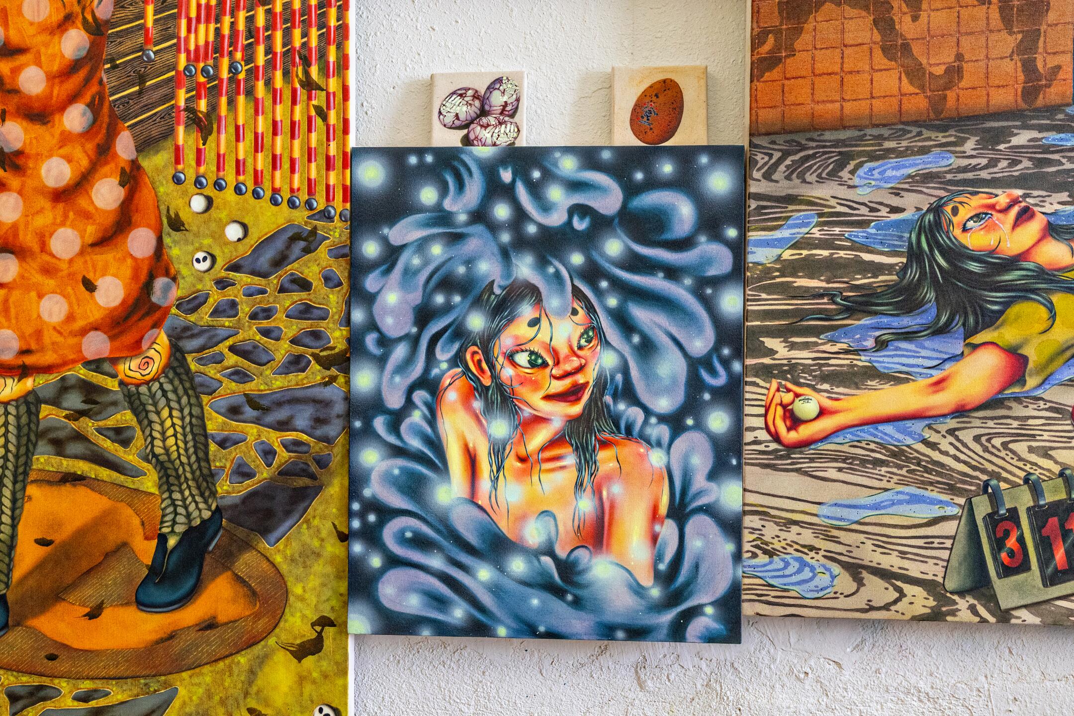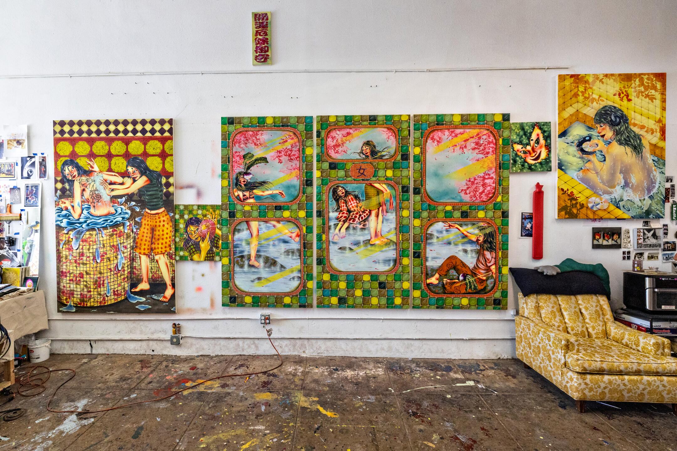 Para M., el Takkyu onsen es un espacio real e imaginario. Mientras que muchos baños modernos muestran áreas para el tenis de mesa, la forma en que M. combina deportes con spas en pinturas más privadas. El es el equipo en Pequeña mesa de Tokio tenis – El club Pingpong, la marca de ropa y la comunidad cultural fundada por su hermano, Jiro majestuoso – y los fanáticos del Grand Spa y Beverly Hot Springs. Ya sea que se metiera en una bañera caliente o golpeó la pelota de ping pong con su paleta, el artista apreció los dos entornos por ayudarlo a concentrarse en concentrarse en su aliento y su cuerpo. Sus pinturas vinieron de esta pausa.