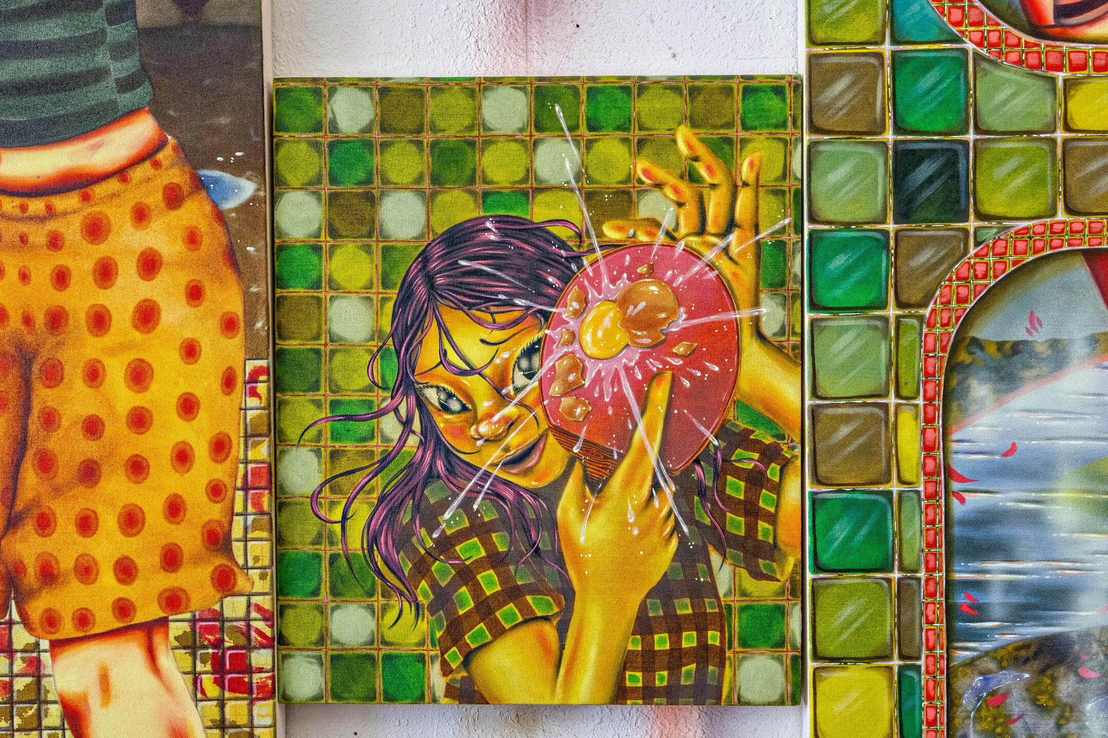 En esta pintura («mariposa -kupu»), tiene un tatuaje de espalda grande, que tradicionalmente no está permitido en los baños. Le hice una mariposa debido al espectáculo sobre este baño que tiene pingpong, y las mariposas son una marca de tenis de mesa muy famosa. Esta pintura es en realidad una imagen que se reutiliza de los baños japoneses tradicionales. Esta es una combinación de muchas cosas diferentes, pero se basa en la imagen real del baño que veo. En la arquitectura, esto es muy similar al baño en la foto, acabo de cambiar todas las baldosas y otras cosas al respecto. Estoy asustado.