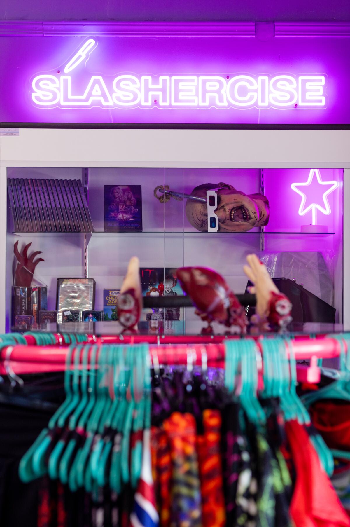 En el sentido de las agujas del reloj desde la izquierda: los accesorios con temas de terror adornan las paredes de la mercancía en el estudio Killer Studio Fitness. Ama Lea sostiene la falsa película de «slashercise» que hizo. Vanessa Decker, Ama Lea y Nadia Teichmann hablaron después de la clase «Slashercise». (Juliana Yamada / Los Angeles Times)