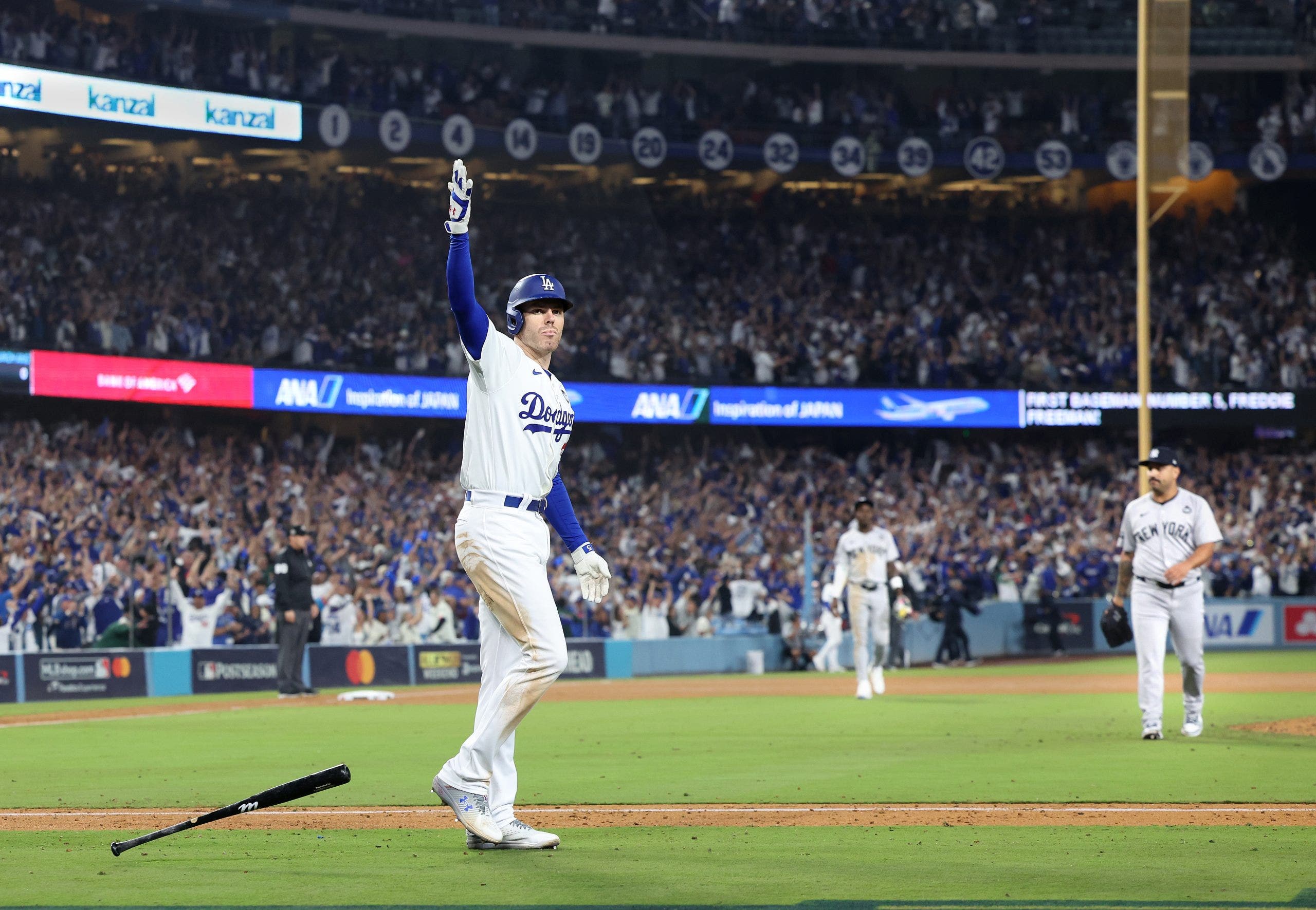 Freddie Freeman bateó el Grand Slam contra Yankis en el Juego 1 de la Serie Mundial en el Dodgers Stadium. (Valley Scaliz/Los Angeles Times por Getty Images)