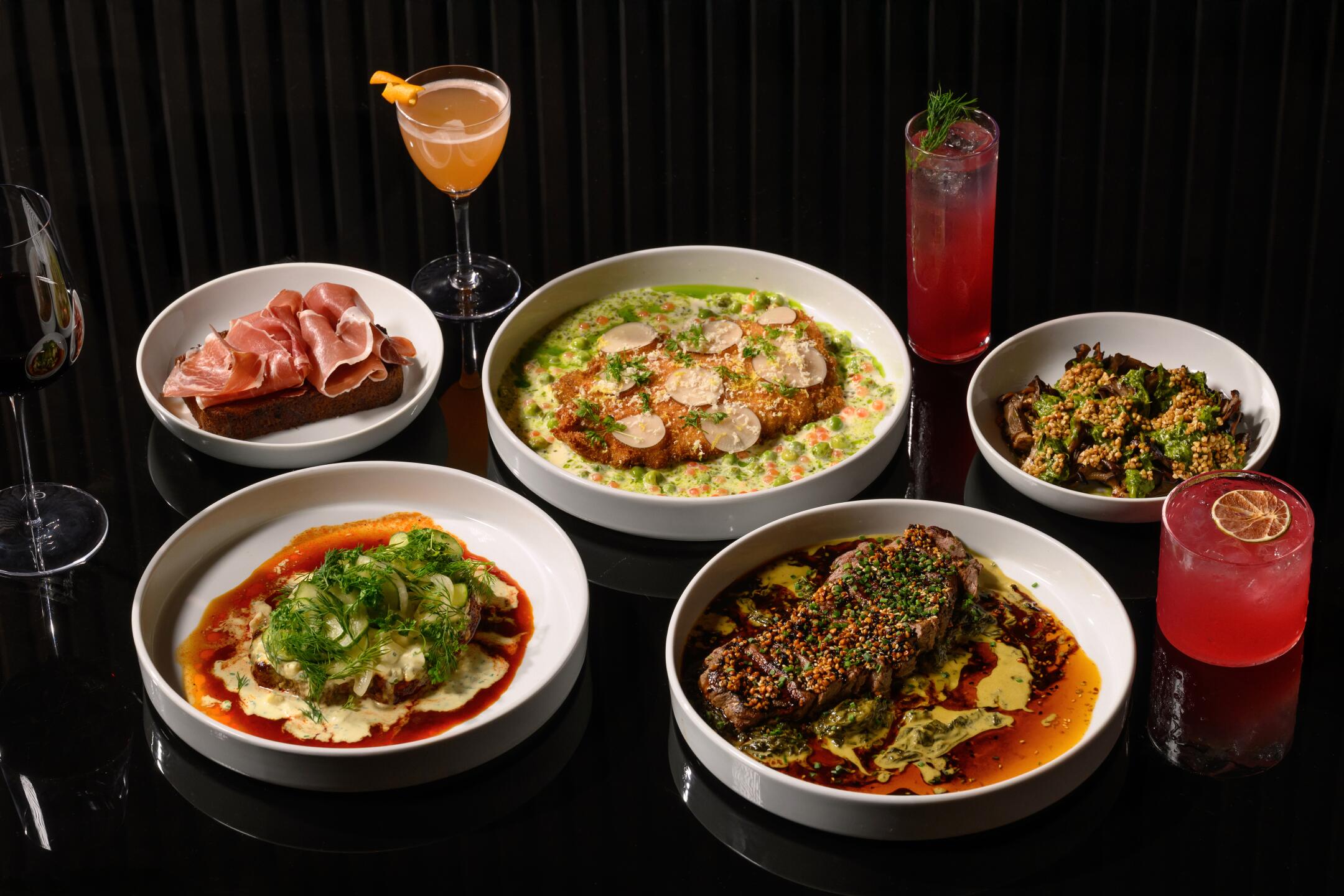 La mesa del cuarto oscuro se extiende, en el sentido de las agujas del reloj: pan de calabacín con jamón serrano, arriba a la izquierda; Cerdo de Schnitzel, hongo Maitake; Nashville Hot Swordfish; y colgador de bistec.