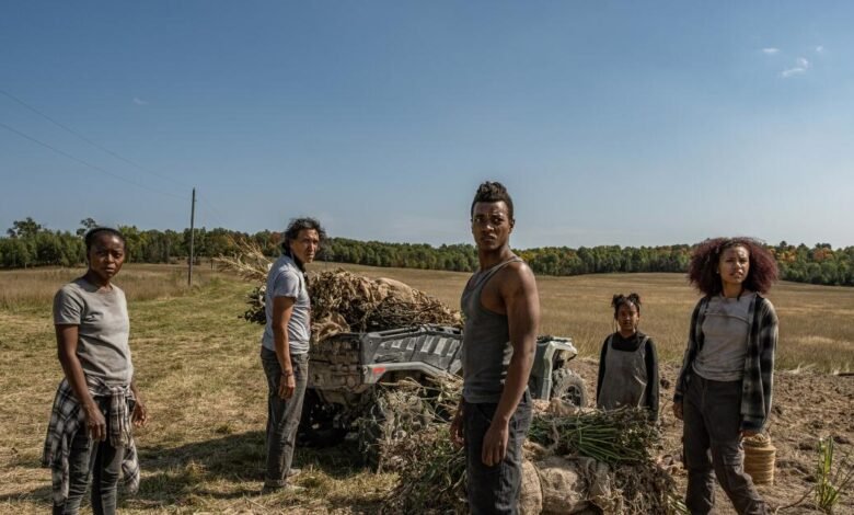 «El gobierno no hace nada más que matar, robar y bloquear a los negros antes de que se desmoronen», dijo Hailey, barriendo la sugerencia de que trabajó con sus vecinos o lo que quedaba del ejército. Los freeman – Hailey, su colega Galen (Michael Greneyes) y su clan mezclado de 20 y tantos años (Kataem O’Connor), las hijas adolescentes Danis y Raine (Jaeda LeBlanc y Leenah Robinson), y la joven galleta (Haile Amare) -Aolaciones en una granja fortificada que se alzó al antepasado escapado de una plantación de Georgia y lo hizo a través del borde de la lata. Para la protección, tienen armas impresionantes, cercas eléctricas y sospechas que son firmes hacia cualquier persona que aparezca.