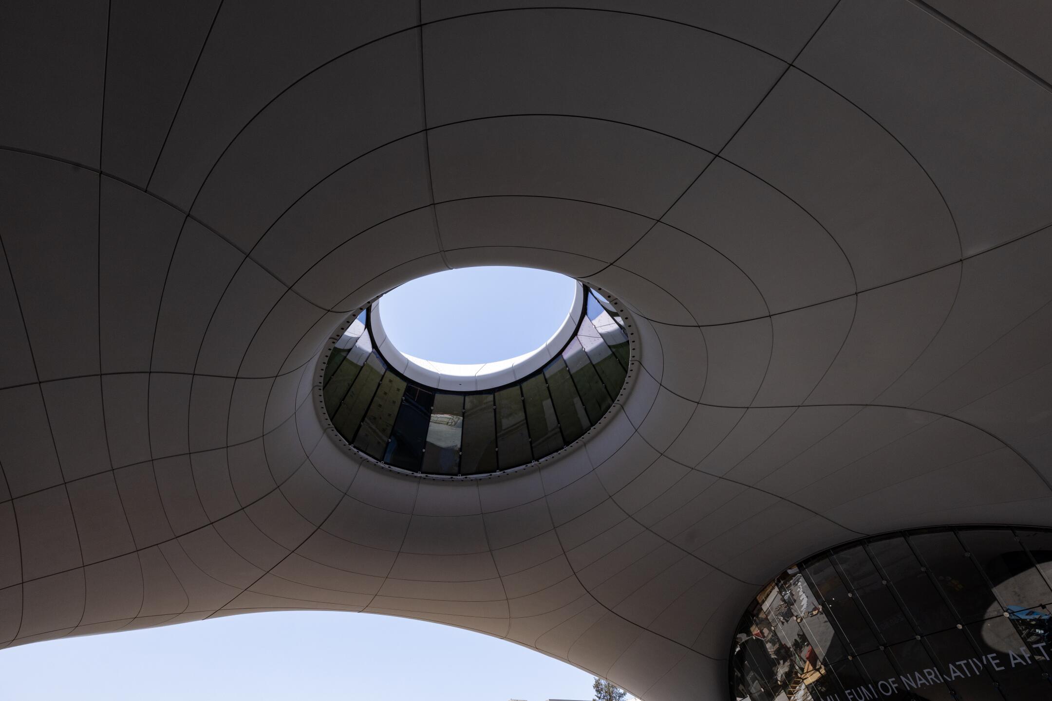 Más cerca del edificio, donde el sistema de absorbedores de masa perimetral doblado por el equipo de diseño de «trinchera» protege al museo de la actividad sísmica, el paisaje se une y parece debajo, el borde de la estructura, oscurece cada vez más la barrera entre los dos. La fila de árboles adultos plantados ahora ayudará a suavizar las alas. Las plantas arrastrantes se colgarán de Lucas Floating Oculus, justo en el campo.