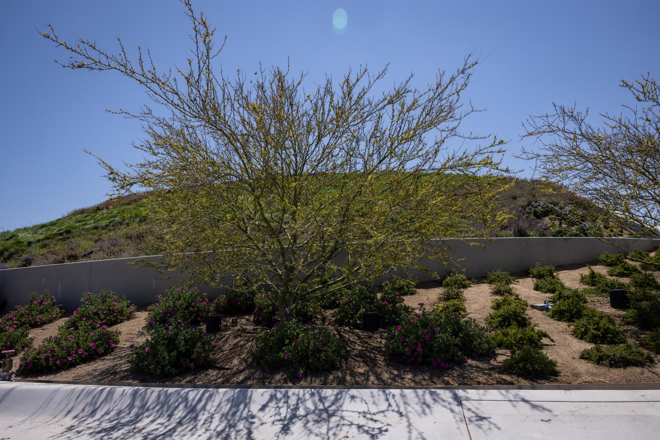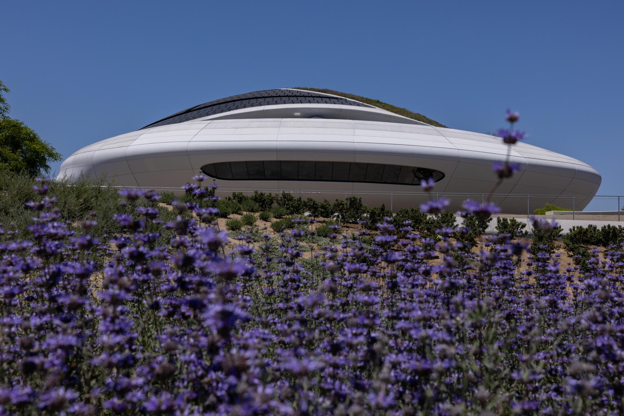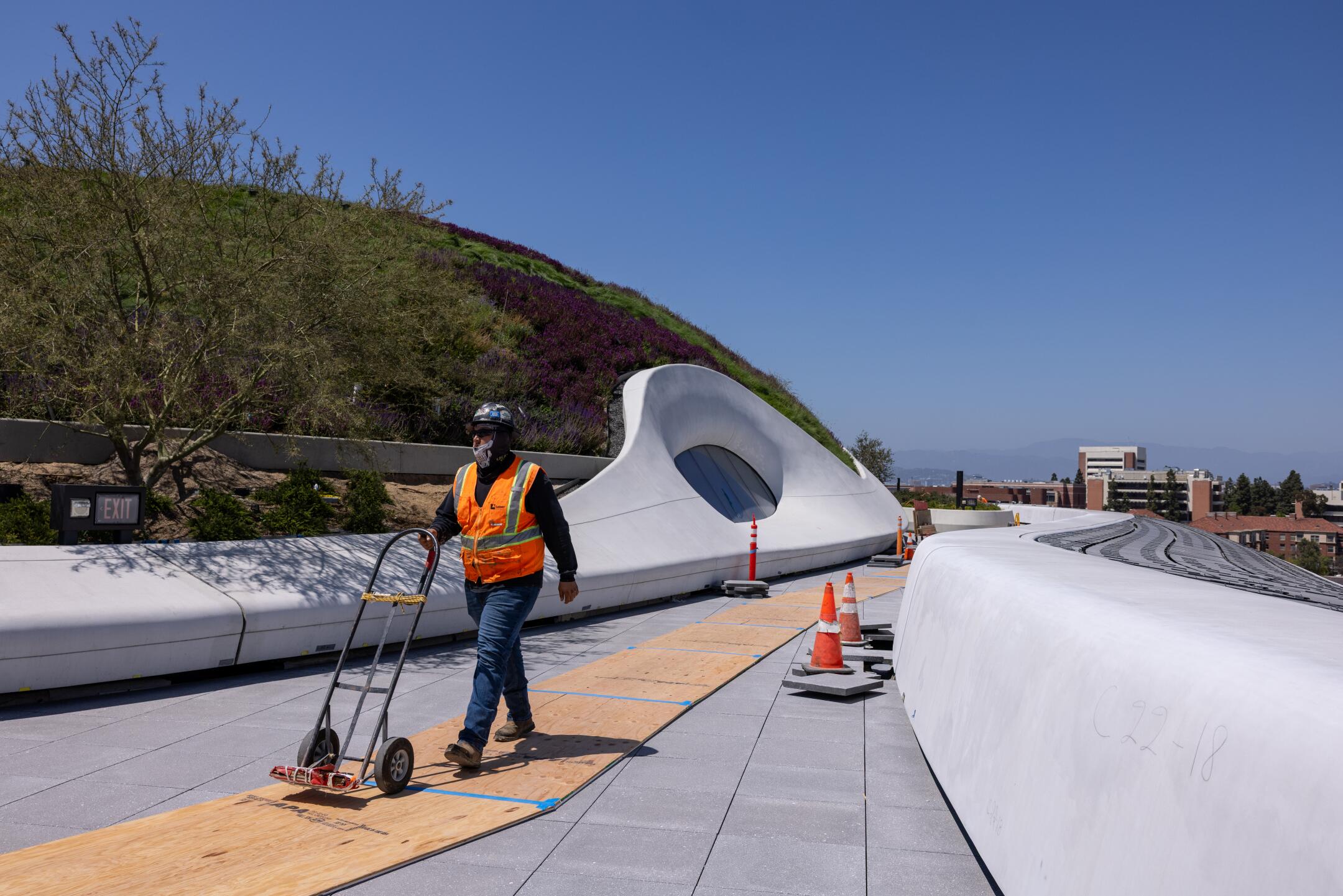Cuando caminas a través del paisaje rodante, queda claro que también está hecho para mezclarse con el diseño de la escultura loca: una forma flotante y erosionada, inspirada en nubes, colinas y otras formas naturales de Los Ángeles.