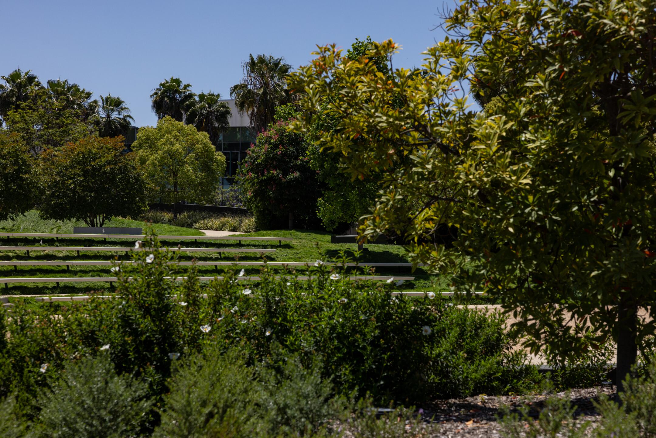 La larga sala de jardines se extiende desde el Museo de Arte Narrativo de Lucas, que se encuentra al lado del Coliseo Memorial de Los Ángeles.